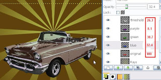 11) Now make all the layers visible. Lower the opacity for each one except for the original car layer. Make it somewhat like mine. The numbers in red are the opacities for each layer. Merge the car layers when done.