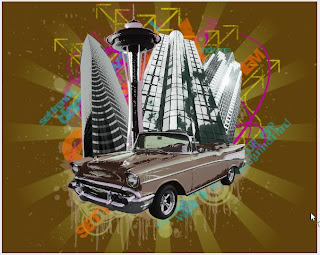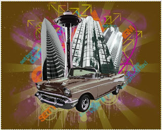 17) Create a new layer under the worded brushes layer and above the foliage layer and name it "vector splatter." Use your splatter brushes once more underneath the car, using a tan color. Afterward, use the circular vector brushes and an off-yellow/brown color and put in some other designs, kinda like mine.