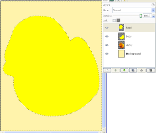 4) Create another new layer and name it "head." This will be for the duck's head. Again, with the selection still active, paint over the head on the new layer. You should now have a completely filled in duck body. Deactivate the selection.